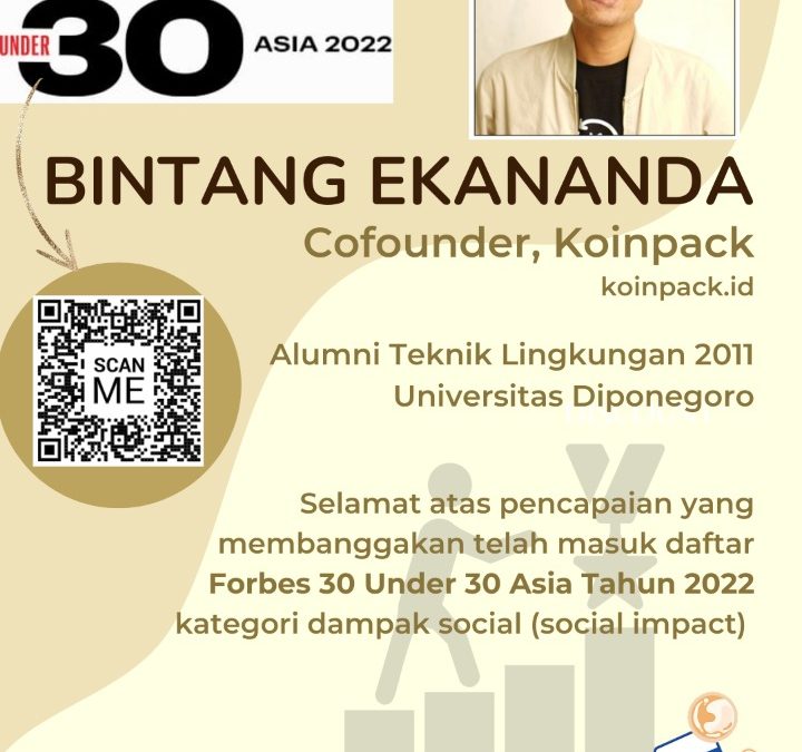 Congratulations on the outstanding achievement of Bintang Ekananda. This Environmental Engineering alumnus of Universitas Diponegoro, class of 2011, has been named to the Forbes 30 Under 30 Asia 2022 list in the Social Impact category.